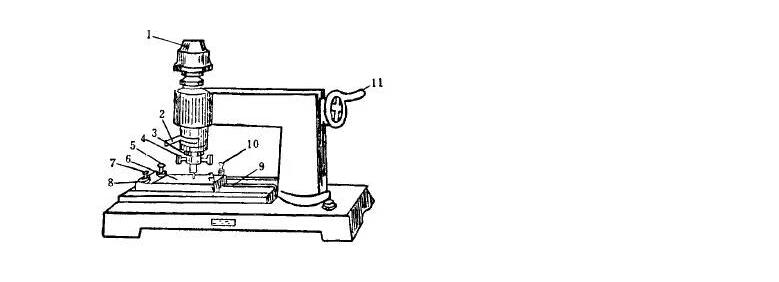 按《漆膜一般制備法》(GB 1727-79)在馬口鐵板上(或按產(chǎn)品標(biāo)準(zhǔn)規(guī)定的底材)制備樣板3塊,待漆膜實(shí)干后,于恒溫恒濕的條件下測(cè)定。測(cè)前先檢查附著力測(cè)定儀的針頭,如不銳利應(yīng)予更換:提起半截螺帽(7),抽出試驗(yàn)臺(tái)(6),即可換針。當(dāng)發(fā)現(xiàn)劃痕與標(biāo)準(zhǔn)回轉(zhuǎn)半徑不符時(shí),應(yīng)調(diào)整回轉(zhuǎn)半徑,其方法是松開卡針盤(3)后面的螺栓、回轉(zhuǎn)半徑調(diào)整螺栓(4),適當(dāng)移動(dòng)卡針盤后,依次緊固上述螺栓,劃痕與標(biāo)準(zhǔn)圓滾線圖比較,如仍不符應(yīng)重新調(diào)整回轉(zhuǎn)半徑,直至與標(biāo)準(zhǔn)回轉(zhuǎn)半徑5.25毫米的圓滾線相同為調(diào)整完畢。測(cè)定時(shí),將樣板正放在試驗(yàn)臺(tái)(6)上,擰緊固定樣板調(diào)整螺栓((5 )、 (8),和調(diào)整螺栓(10),向后移動(dòng)升降棒(2),使轉(zhuǎn)針的尖端接觸到漆膜,如劃痕未露底板,應(yīng)酌加硅碼。按順時(shí)針方向,均勻搖動(dòng)搖柄(11),轉(zhuǎn)速以80一100轉(zhuǎn)/分為宜,圓滾線劃痕標(biāo)準(zhǔn)圖長(zhǎng)為7.5士0.5厘米。向前移動(dòng)升降棒(2),使卡針盤提起,松開固定樣板的有關(guān)螺栓(5)、(8)、 (10),取出樣板,用漆刷除去劃痕上的漆屑,以四倍放大鏡檢查劃痕并評(píng)級(jí)。